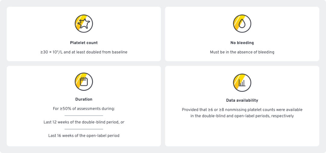 Durable platelet response: A platelet count of >50x109/L for >5 of at least 8 non-missing weekly measurements during the last 12 weeks of the double blind period, including >2 such responses in the last 6 weeks without rescue therapy.1,2