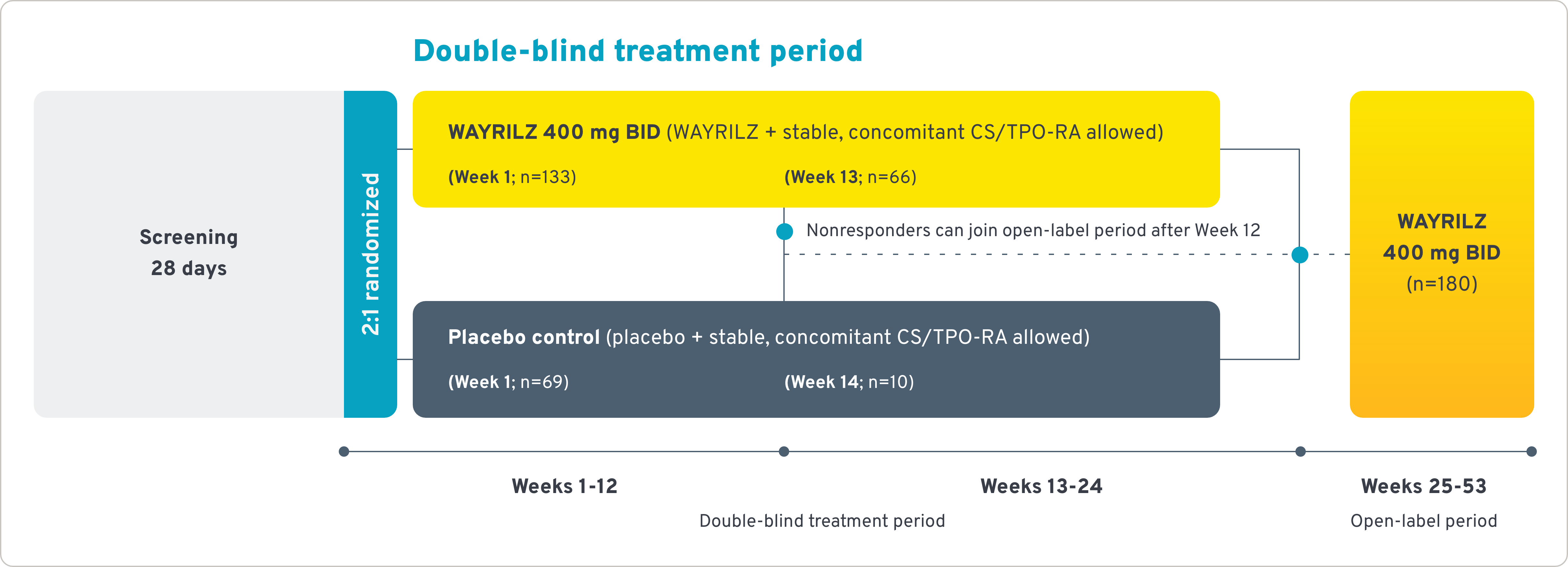 WAYRILZ durable responders: Patients achieving a platelet count ≥50 × 10⁹/L for ≥5 of at least ≥8 nonmissing weekly measurements during the last 12 weeks of the double-blind period, including ≥2 such responses in the last 6 weeks without rescue therapy.