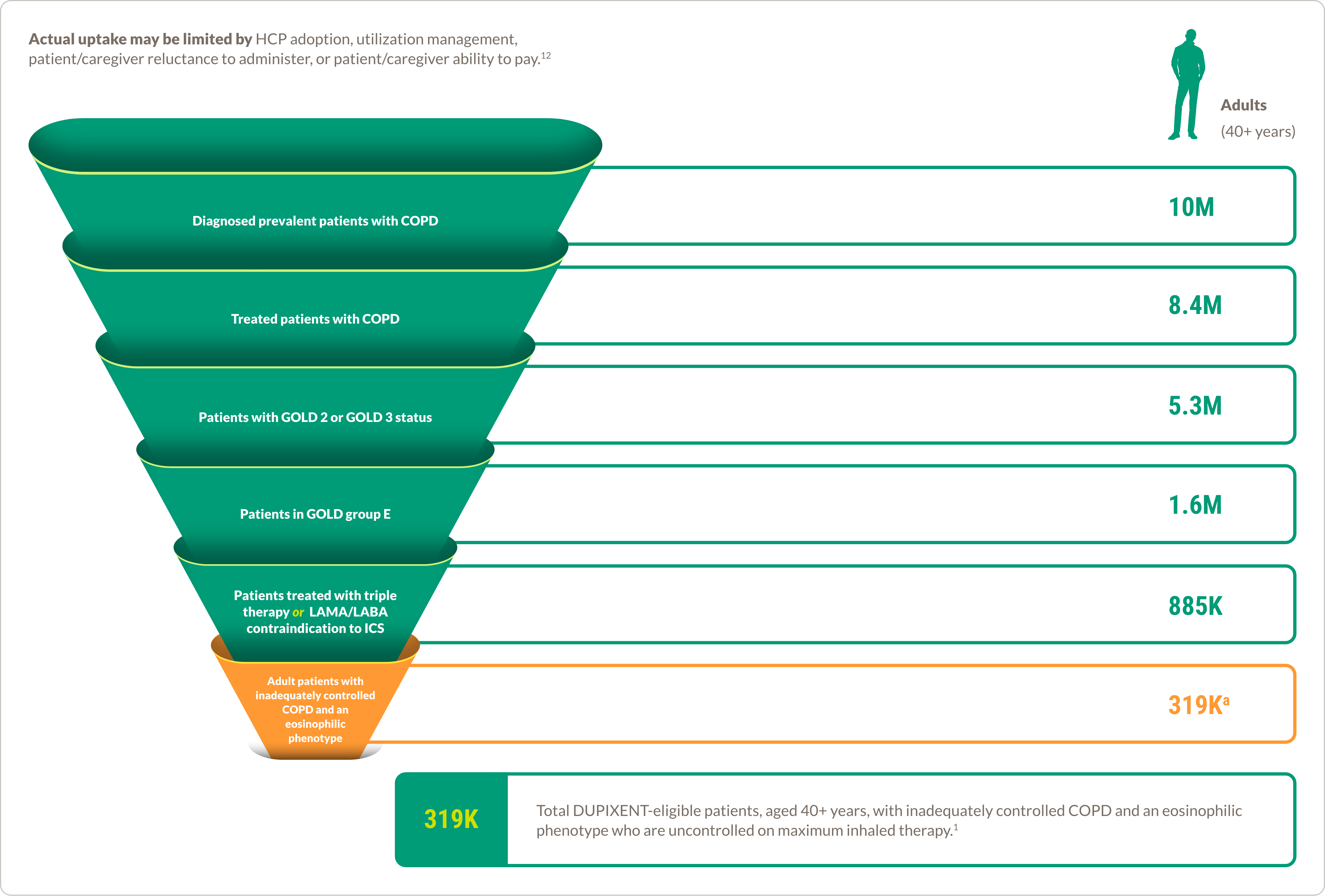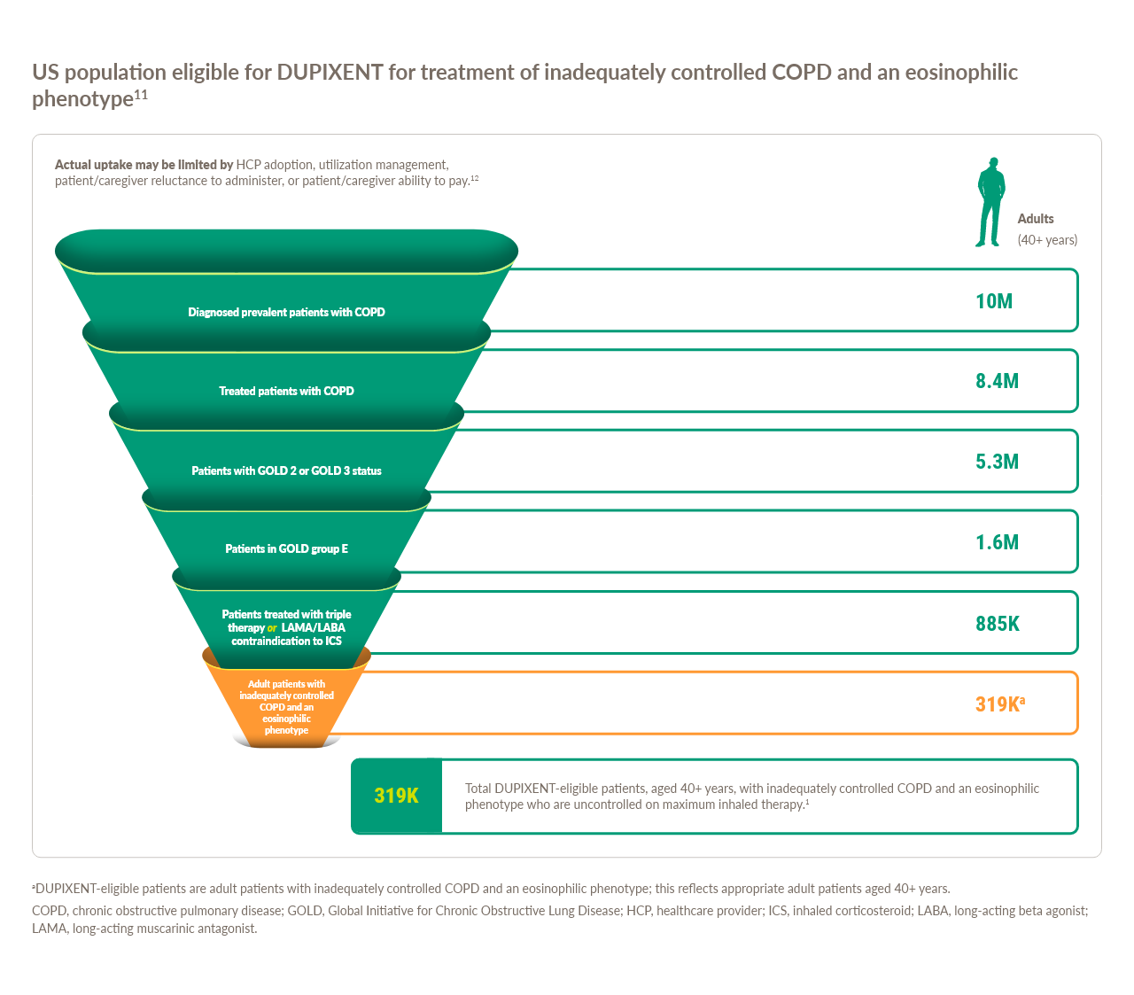 Approximately 319,000 patients aged 40+ years with inadequately controlled chronic obstructive pulmonary disease (COPD) and an eosinophilic phenotype who are uncontrolled on maximum inhaled therapy are eligible for DUPIXENT.13