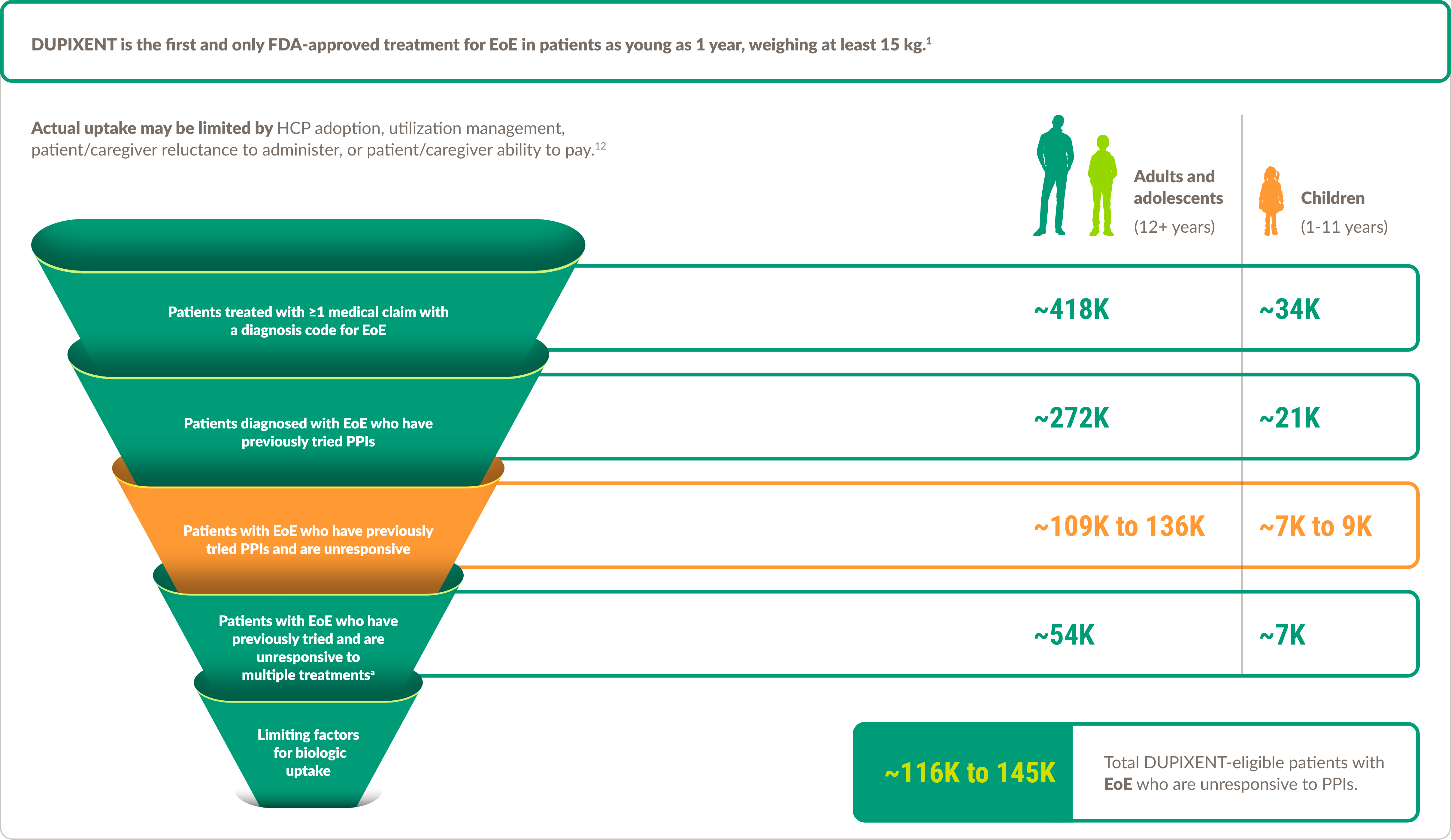 Approximately 116,000 to 145,000 patients with EoE who are unresponsive to proton pump inhibitors are eligible for DUPIXENT.13