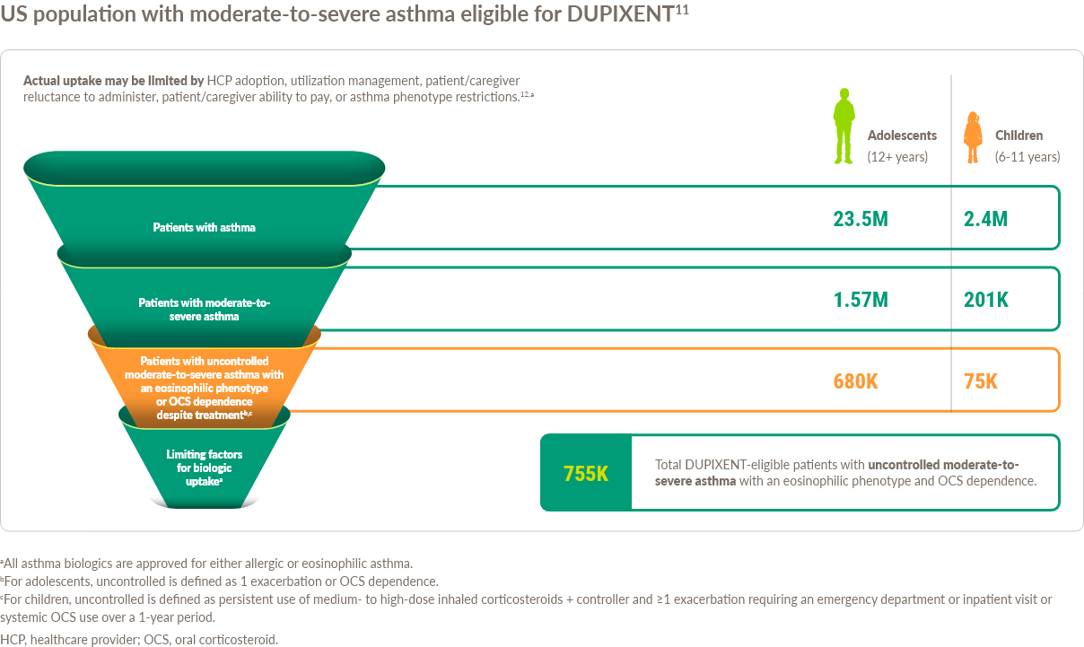 The total number of patients with uncontrolled moderate-to-severe asthma with an eosinophilic phenotype and oral corticosteroid (OCS) dependence who are eligible for DUPIXENT is 755,000.13