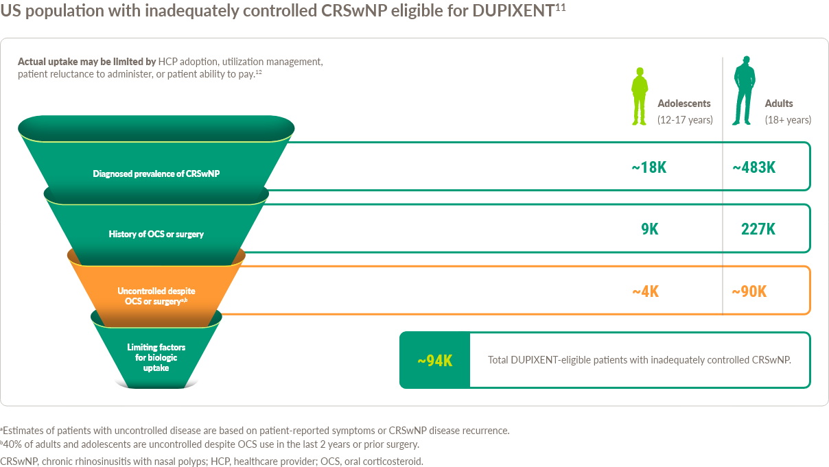 Approximately 94,000 to 99,000 patients with inadequately controlled chronic rhinosinusitis with nasal polyps (CRSwNP) are eligible for DUPIXENT.13