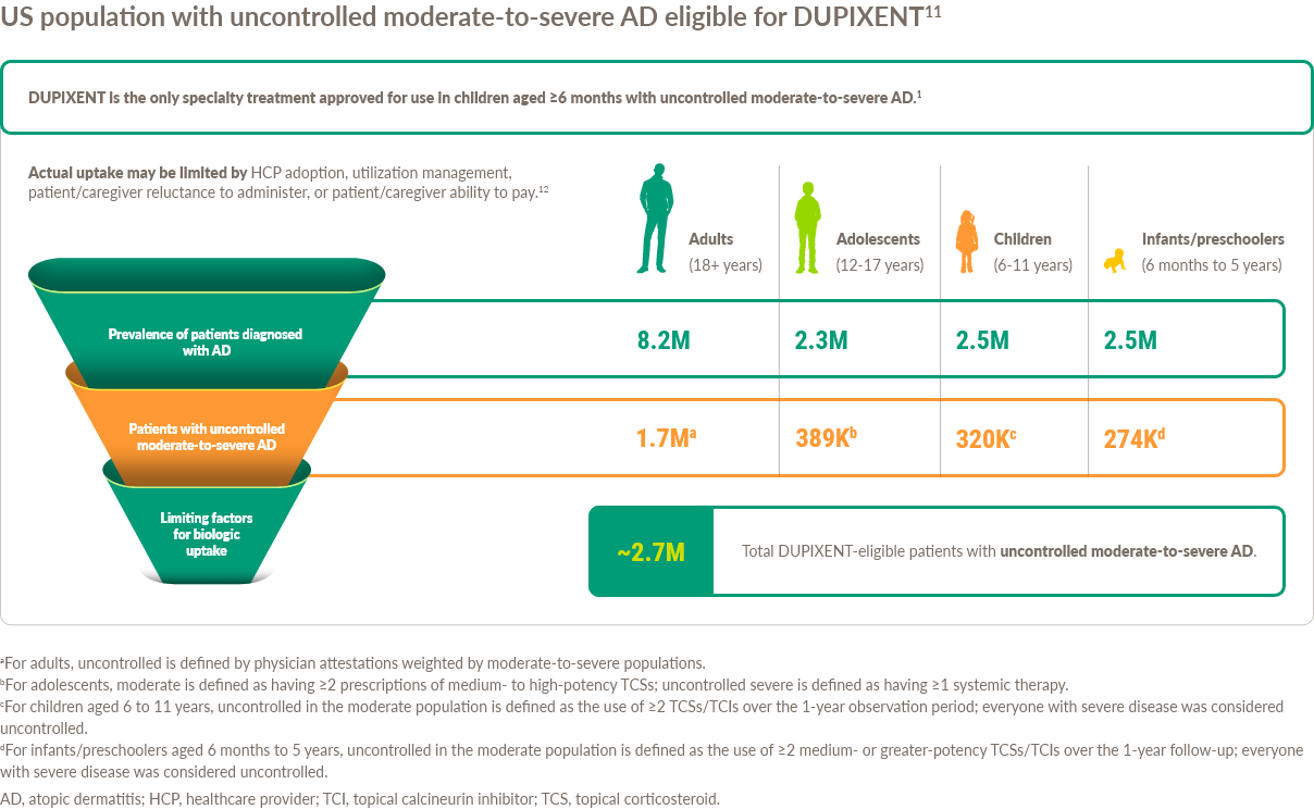 Approximately 2.7 million patients with uncontrolled moderate-to-severe AD are eligible for DUPIXENT.13