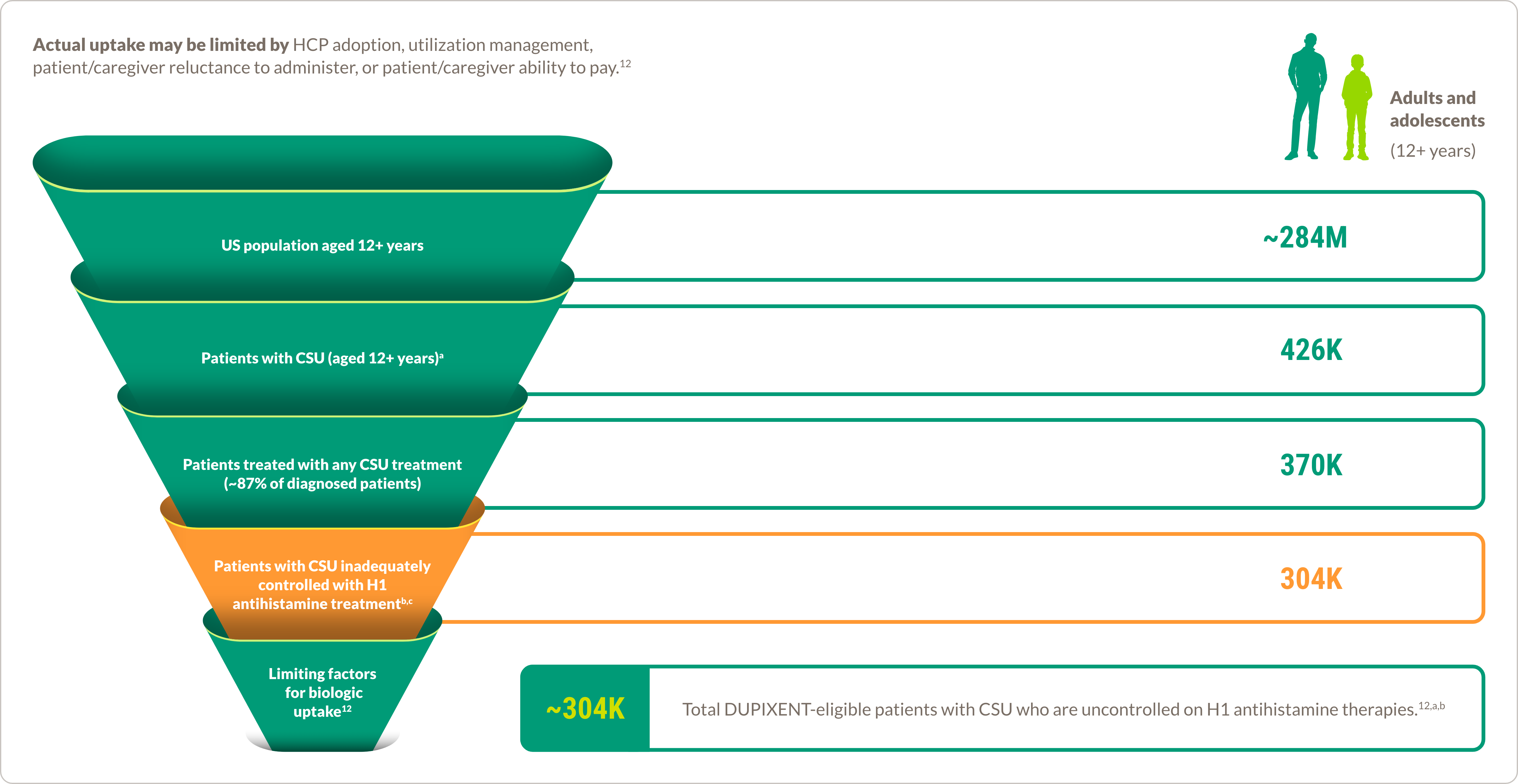 Approximately 304,000 patients with chronic spontaneous urticaria (CSU) who are uncontrolled on H1 antihistamine therapies are eligible for DUPIXENT.13