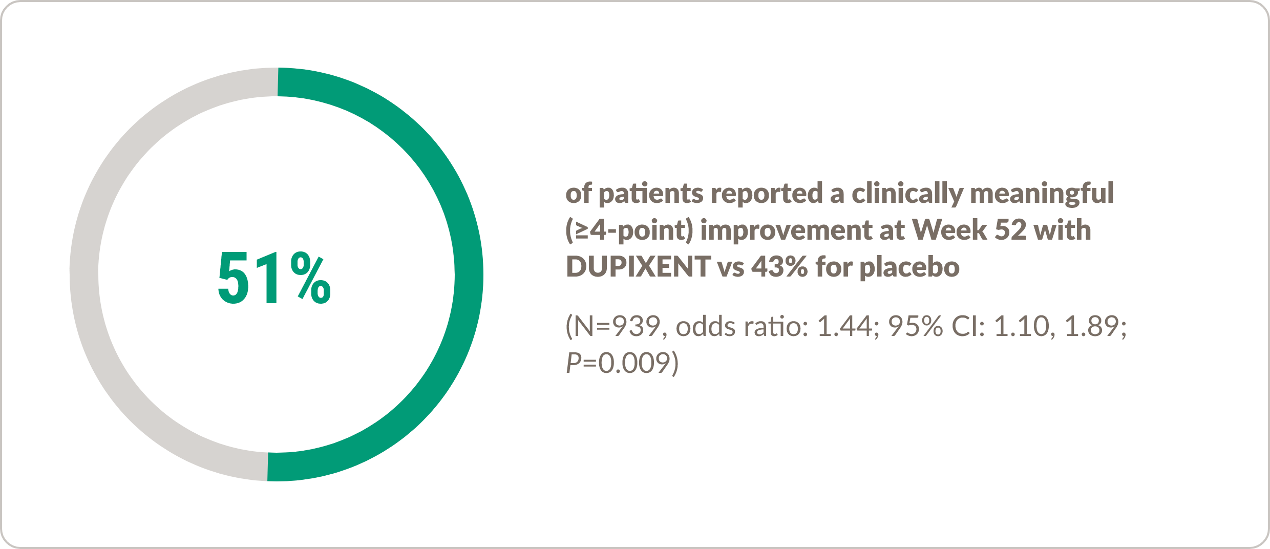 There was a 51% responder rate at Week 52 for subjects treated with DUPIXENT vs 47% for placebo (N=721, odds ratio: 1.16; 95% CI: 0.86, 1.58).