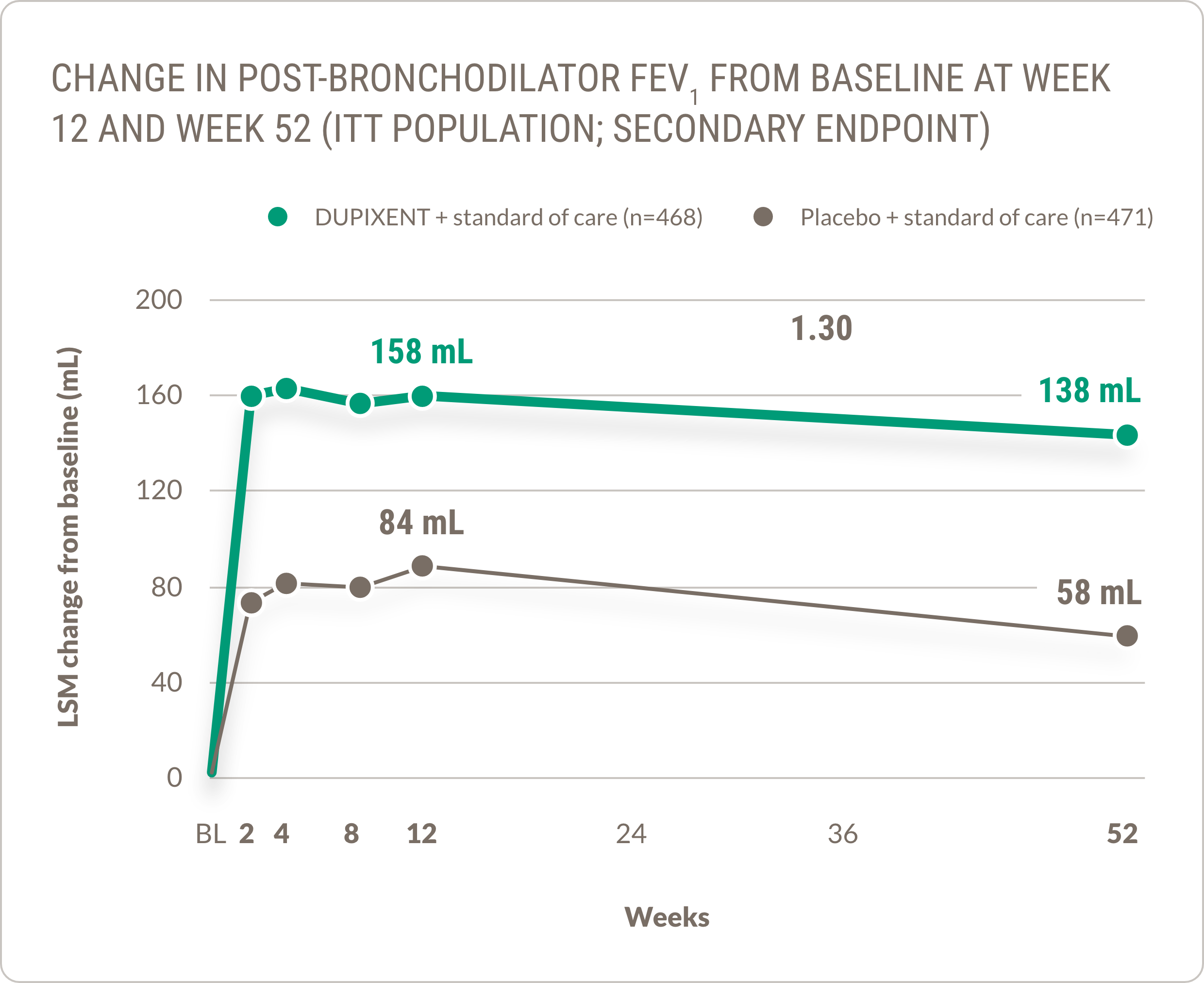 Patients administered DUPIXENT + standard of care saw numerical improvement in post-bronchodilator FEV1 of 134 mL at Week 12 (n=470) and 127 mL at Week 52 (n=362), compared with 67 mL at Week 12 (n=465) and 59 mL at Week 52 (n=359) in patients receiving placebo + standard of care (LSM change from baseline, ITT population).